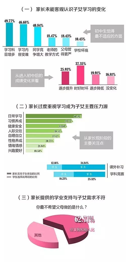 初中阶段的学习与小学相比有较大变化,初中生觉得最不适应的方面依次是学习科目增多(49.77%)、学习内容变难(46.68%)、同学竞争增大(40.84%)、老师的教学方式(18.47%)、父母管得更严(18.43%)、学校环境(10.45%)。面对诸多的不适,学生与家长双方都需要心理上的调适,以更好地适应初中学习。