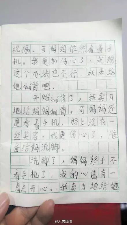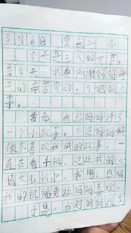 在妇女节当天,一个读二年级的小学生,给妈妈讲故事、捶背…可妈妈却一直在低头看手机。孩子很伤心,于是写下了这篇日记。