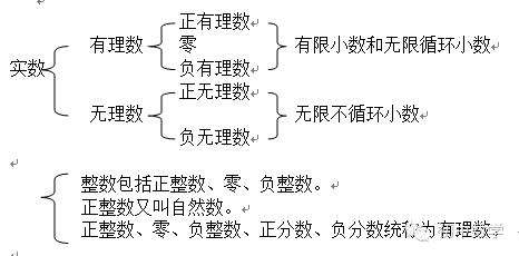 数姐有话 今天数姐整理了一下《实数》部分的考点,这块内容作为基础非常重要,很多同学到中考或者高考时,丢分严重,不是因为不会做,而是因为计算能力不过关!所以,新学这块内容的同学一定注意了哈!计算能力一定要培养好! 考点一、实数的概念及分类 1、实数的分类 2、无理数 在理解无理数时,要抓住“无限不循环”这一点,归纳起来有四类: (1)开方开不尽的数,如等; (2)有特定意义的数,如圆周率π,或化简后含有π的数,如+8等; (3)有特定结构的数,如0.1010010001…等; (4)某些三角函数,如sin60o等(这类在初三会出现) 考点二、实数的倒数、相反数和绝对值 1、相反数 实数与它的相反数是一对数(只有符号不同的两个数叫做互为相反数,零的相反数是零),从数轴上看,互为相反数的两个数所对应的点关于原点对称,如果a与b互为相反数,则有a+b=0,a=-b,反之亦成立。 2、绝对值 一个数的绝对值就是表示这个数的点与原点的距离,|a|≥0。零的绝对值是它本身,若|a|=a,则a≥0;若|a|=-a,则a≤0。正数大于零,负数小于零,正数大于一切负数,两个负数,绝对值大的反而小。 3、倒数 如果a与b互为倒数,则有ab=1,反之亦成立。 倒数等于本身的数是1和-1。 零没有倒数。 考点三、平方根、算数平方根和立方根 1、平方根 如果一个数的平方等于a,那么这个数就叫做a的平方根(或二次方跟)。 一个数有两个平方根,它们互为相反数;零的平方根是零;负数没有平方根。 正数a的平方根记做“ 2、算术平方根 正数a的正的平方根叫做a的算术平方根,记作“”。 正数和零的算术平方根都只有一个,零的算术平方根是零。 3、立方根 如果一个数的立方等于a,那么这个数就叫做a 的立方根(或a 的三次方根)。 一个正数有一个正的立方根;一个负数有一个负的立方根;零的立方根是零。 注意: 考点四、科学记数法 把一个数写做 考点五、实数大小的比较 1、数轴 规定了原点、正方向和单位长度的直线叫做数轴(画数轴时,要注意上述规定的三要素缺一不可)。 解题时要真正掌握数形结合的思想,理解实数与数轴的点是一一对应的,并能灵活运用。 2、实数大小比较的几种常用方法 (1)数轴比较:在数轴上表示的两个数,右边的数总比左边的数大。 (2)求差比较:设a、b是实数, (3)求商比较法:设a、b是两正实数, (4)绝对值比较法:设a、b是两负实数,则。 (5)平方法:设a、b是两负实数,则。 考点六、实数的运算 (做题的基础,分值相当大) 1、加法交换律 2、加法结合律 3、乘法交换律 4、乘法结合律 5、乘法对加法的分配律 6、实数混合运算时,对于运算顺序有什么规定? 实数混合运算时,将运算分为三级,加减为一级运算,乘除为二级运算,乘方为三级运算。同级运算时,从左到右依次进行;不是同级的混合运算,先算乘方,再算乘除,而后才算加减;运算中如有括号时,先做括号内的运算,按小括号、中括号、大括号的顺序进行。 7、有理数除法运算法则就什么? 有理数除法运算法则可用两种方式来表述:第一,除以一个不等于零的数,等于乘以这个数的倒数;第二,两数相除,同号得正,异号得负,并把绝对值相除。零除以任何一个不为零的数,商都是零。 8、什么叫有理数的乘方?幂?底数?指数? 相同因数相乘的积的运算叫乘方,乘方的结果叫幂,相同因数的个数叫指数,这个因数叫底数。记作: an 9、有理数乘方运算的法则是什么? 负数的奇次幂是负数,负数的偶次幂是正数。正数的任何次幂都是正数。零的任何正整数幂都是零。 10、加括号和去括号时各项的符号的变化规律是什么? 去(加)括号时如果括号外的因数是正数,去(加)括号后式子各项的符号与原括号内的式子相应各项的符号相同;括号外的因数是负数去(加)括号后式子各项的符号与原括号内式子相应各项的符号相反。
