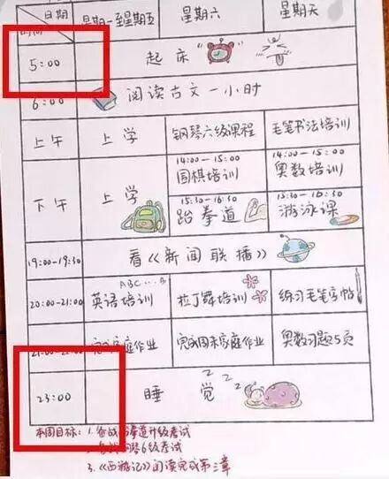 前一段时间,朋友圈中非常流行一张“小P孩的作息时间表”,这张表规定了“小P孩”从早上5点起床,到晚上11点睡觉,中间18个小时疯狂地学习各种知识,其中涵盖了英语、奥数、毛笔、跆拳道等等种类,几乎没有空余的时间。看得大人们都想喊:“臣妾做不到啊!”